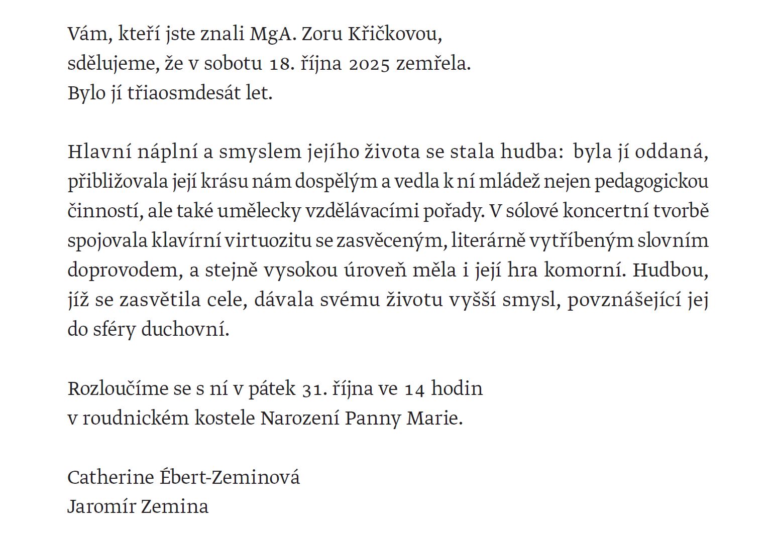 V sobotu 18. října ve věku 83 let zemřela klavíristka Zora Křičková. Poslední rozloučení proběhne v pátek 31. října ve 14 hodin v roudnickém kostele Narození Panny Marie. Parte: