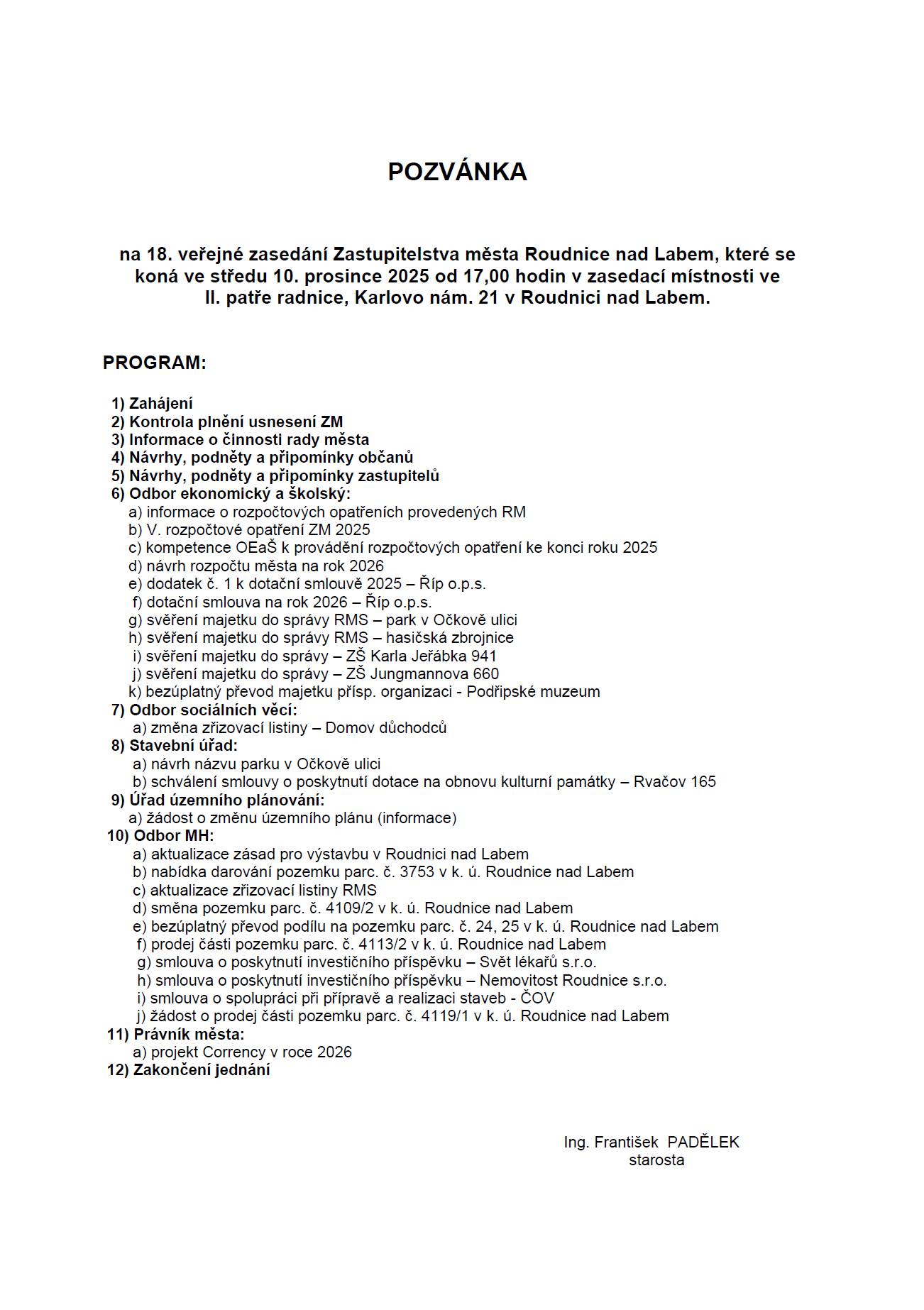 Vedení města zve na 18. veřejné zasedání Zastupitelstva města Roudnice nad Labem, které se koná ve středu 10. prosince 2025 od 17.00 hod. v zasedací místnosti ve druhém patře budovy radnice na Karlově náměstí. Mezi hlavní body programu patří jednání o návrhu rozpočtu města pro nadcházející rok 2026.