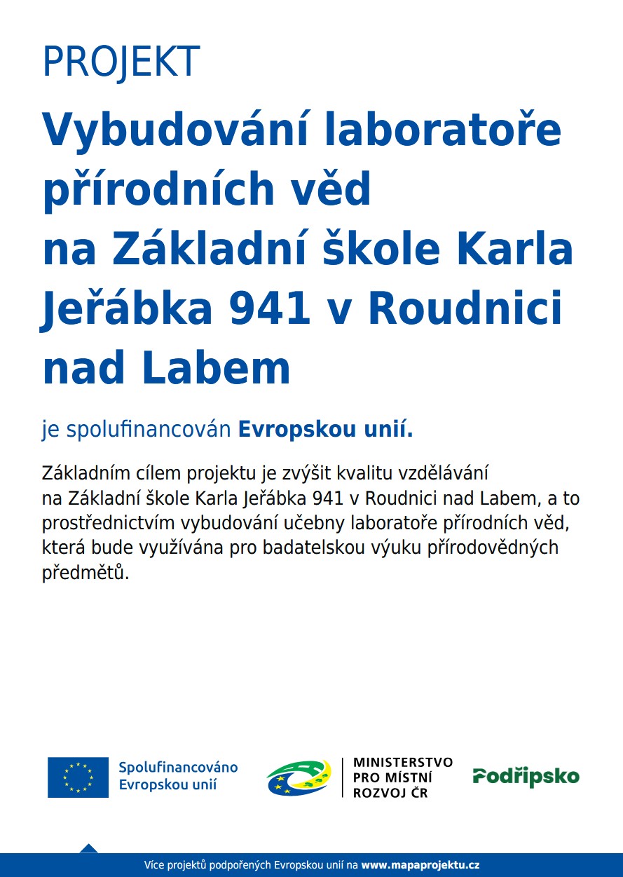 V rámci projektu podpořeného Evropskou unií byla na Základní škole Karla Jeřábka v Roudnici nad Labem vybudována nová laboratorní učebna. Žáci v ní získali zázemí pro badatelskou výuku přírodních věd a tím i kvalitnější vzdělávání. Kromě vybavení vhodným nábytkem a pomůckami byly potřebné i stavební úpravy - nahrazení povrchu podlahy, úprava elektroinstalace, výměna osvětlení a na závěr i výmalba.