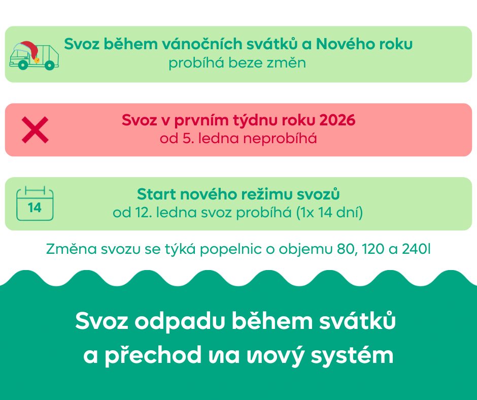 Svoz odpadů o vánočních svátcích proběhne bez omezení. Po Novém roce však přijde plánovaná změna roudnického odpadového systému. Interval svozu nádob na směsný odpad se prodlouží na dvoutýdenní. Pohodlné třídění podpoří častější vývoz kontejnerů na papír a plast.