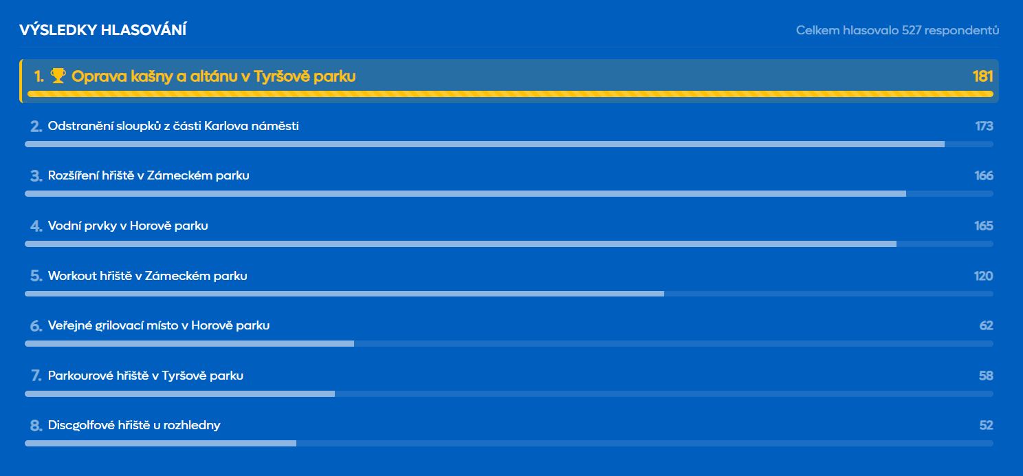 Celkem 527 respondentů v anketě osmi veřejností navrženým projektům rozdělilo 977 hlasů. Děkujeme za váš zájem, kterým jste o několik desítek překonali loňský ročník. Vzhledem k očekávaným nákladům Rada města v minulém týdnu rozhodla o přípravě a realizaci jednoho vítězného projektu. Nejúspěšnějším návrhem se stala oprava kašny a altánu v Tyršově parku. Mezi dalšími však u hlasujících zabodovaly i úpravy Karlova náměstí, rozšíření hřiště v Zámeckém parku či vodní prvky v parku Josefa Hory.