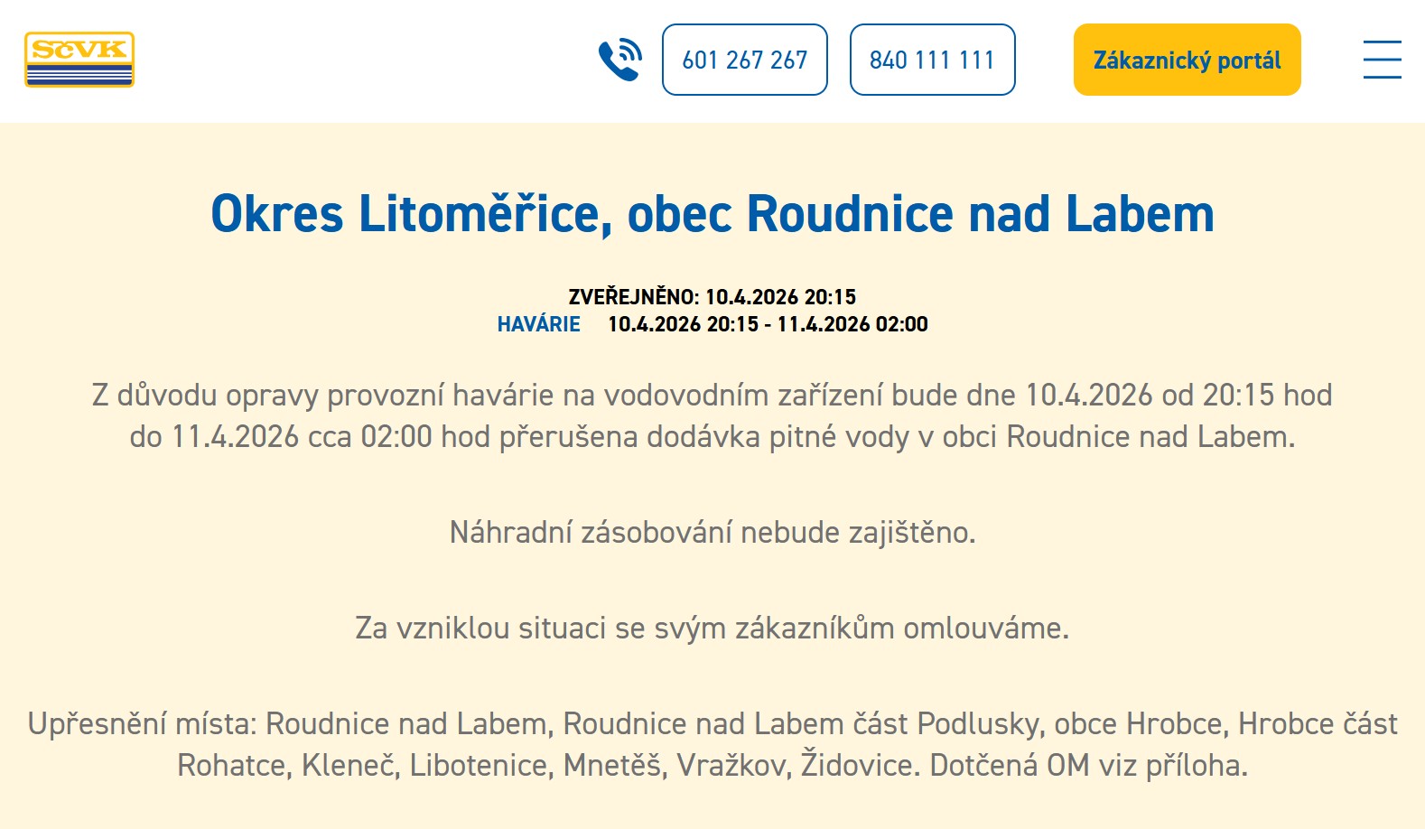 Severočeské vodovody a kanalizace právě oznámily provozní havárii na hlavním vodovodním přivaděči. Z toho důvodu bude cca od dnešních 22:00 v Roudnici nad Labem přerušena dodávka vody. Opravy mají být dokončeny do zítřejšího poledne. Děkujeme za pochopení a trpělivost.